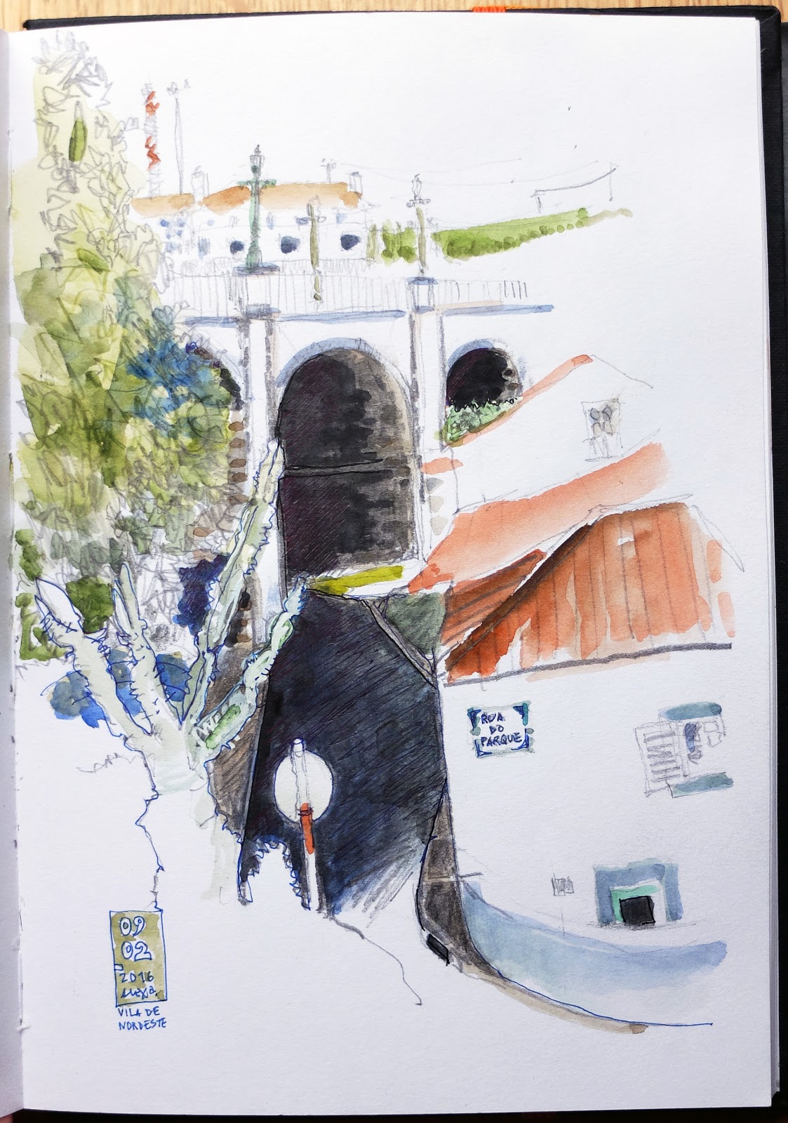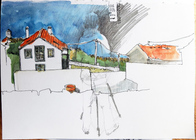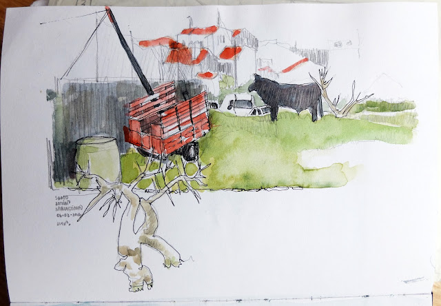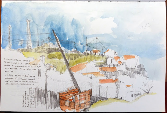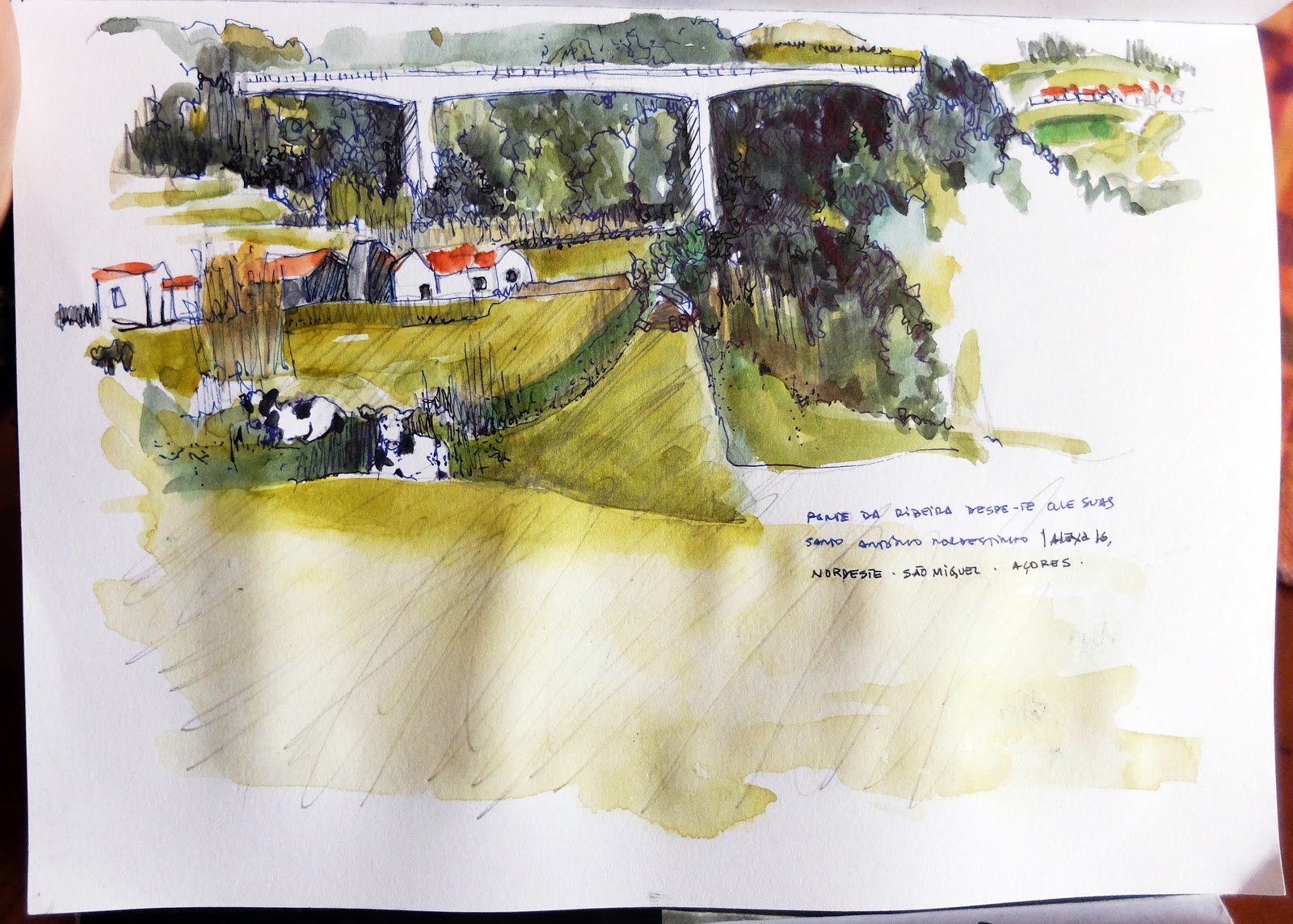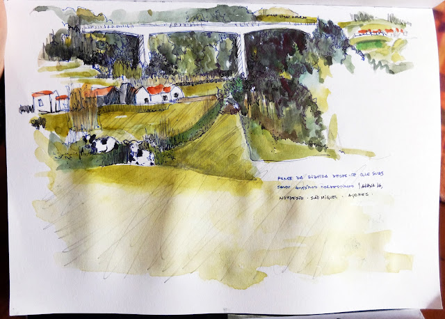 | Em Santo António Nordestinho na Rua da Bela Vista o postal é amplo à esquerda (desenho de cima) vê-se a ponte sobre a ribeira Despe-te que Suas, julgo que tem um dos maiores vãos da Europa e contrasta acentuadamente com a paisagem natural... e à direita (desenho de baixo) acede-se à cumeeira das Sete Cidades... parece que é já ali. (Grafite e aguarela) | «in situ» | |