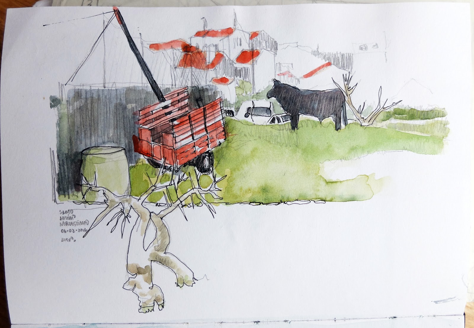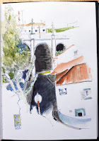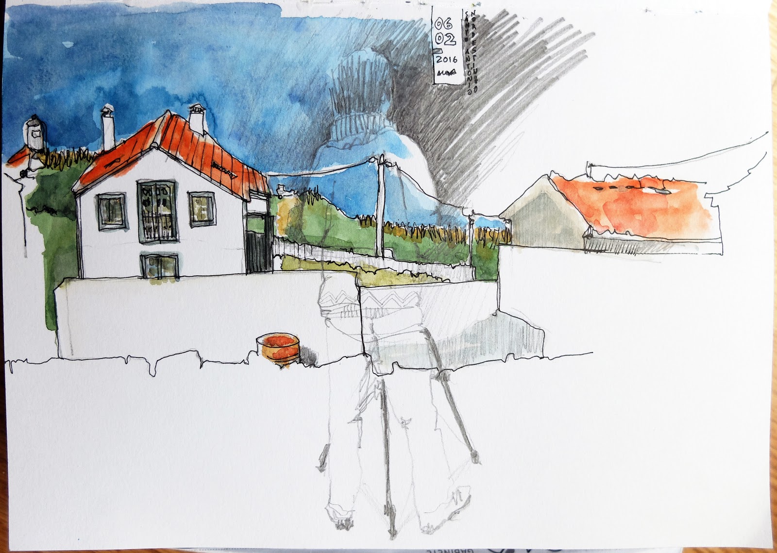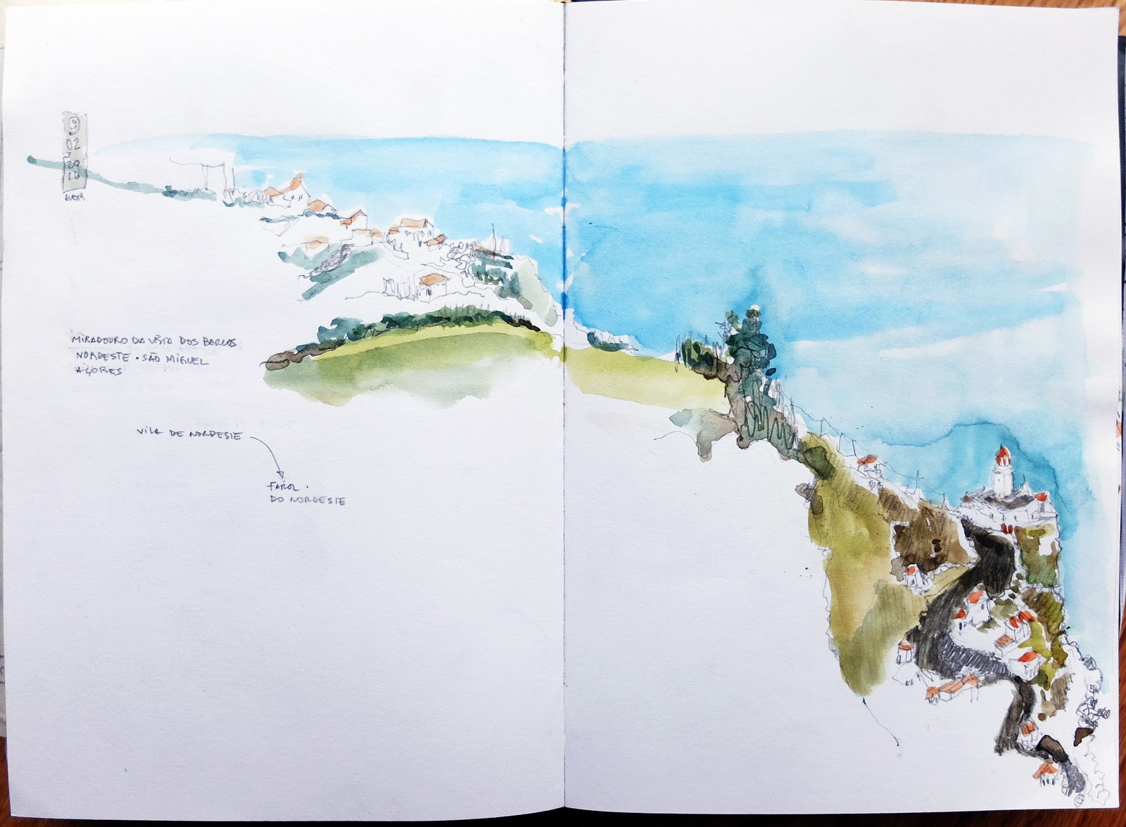 | Em Santo António Nordestinho na Rua da Bela Vista o postal é amplo à esquerda (desenho de cima) vê-se a ponte sobre a ribeira Despe-te que Suas, julgo que tem um dos maiores vãos da Europa e contrasta acentuadamente com a paisagem natural... e à direita (desenho de baixo) acede-se à cumeeira das Sete Cidades... parece que é já ali. (Grafite e aguarela) | «in situ» | |
