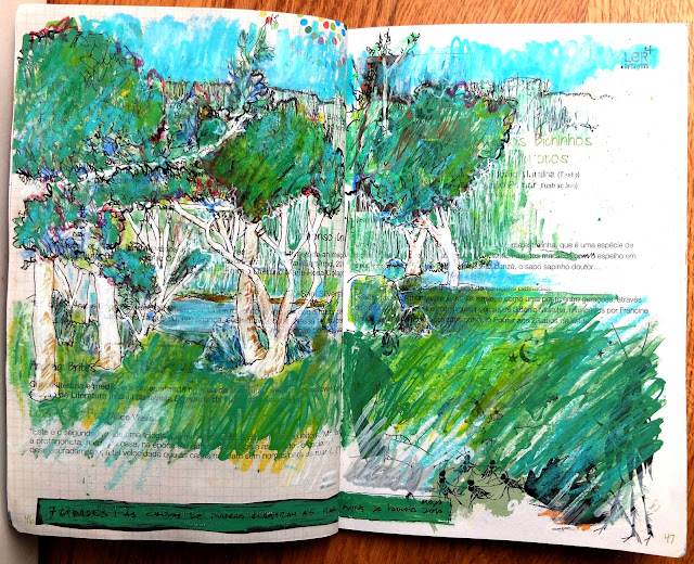 À beira da Lagoa das Sete Cidades experimentei no caderno da série: 100 PÁGINAS que crescem comigo os meus lápis de cera aguareláveis e os marcadores acrílicos...