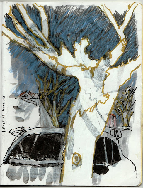 Enquanto esperava pelos rapazes resolvi experimentar um marcador novo... o caderno está a chegar ao fim e preferi aproveitar as manchas aleatórias que esta página tinha...